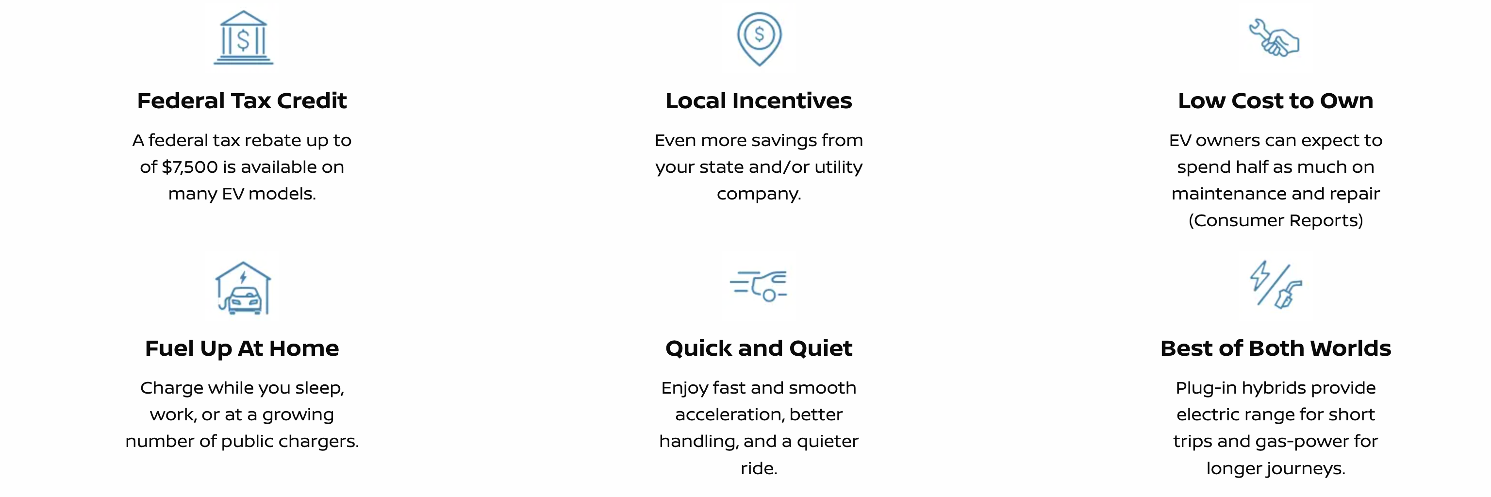 A federal tax rebate of $7,500 is available on most EV models. Depending on where you live, state and local rebates and incentives may also be available. Check with your sales associate to find out if the model is eligible for rebates and incentives.